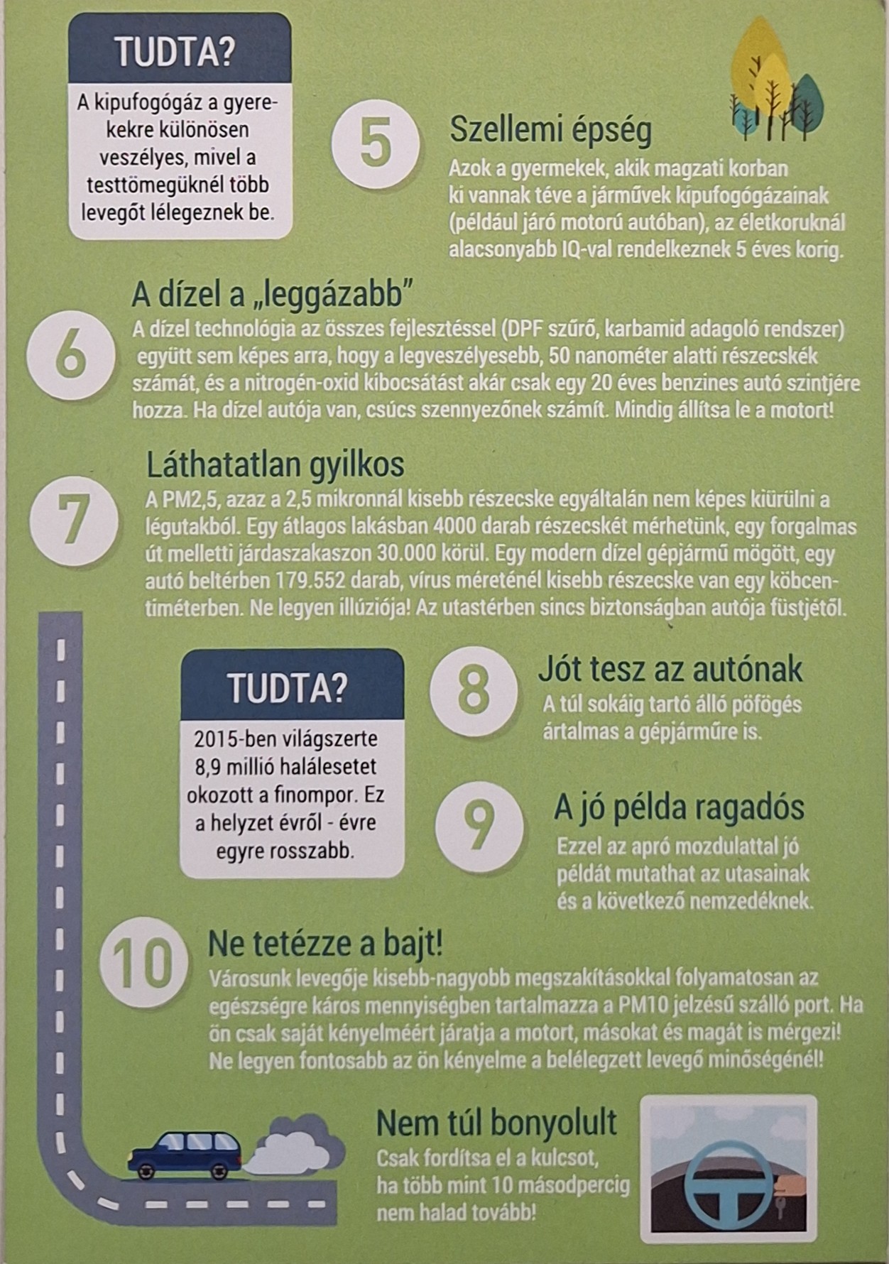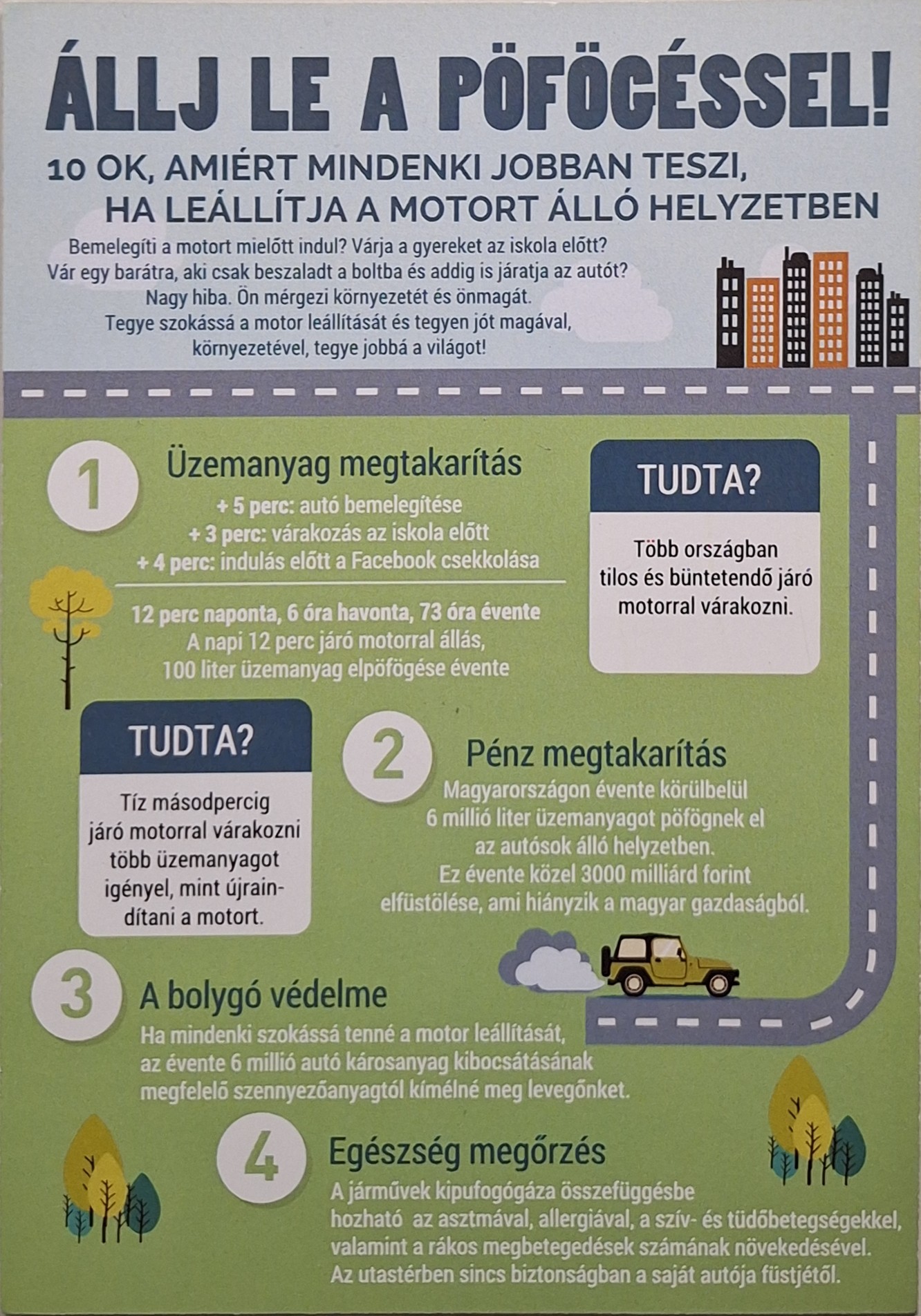 A Zöld Akciócsoporttal együttműködve két új táblát helyeztünk ki Nyíregyházán, a Búzaszem Nyugati Óvoda és a Tündérkert Keleti Óvoda bejárata előtt. A kezdeményezés célja, hogy tudatosítsuk: a járó motorral való várakozás jelentősen károsítja egészségünket és közvetlen környezetünket.